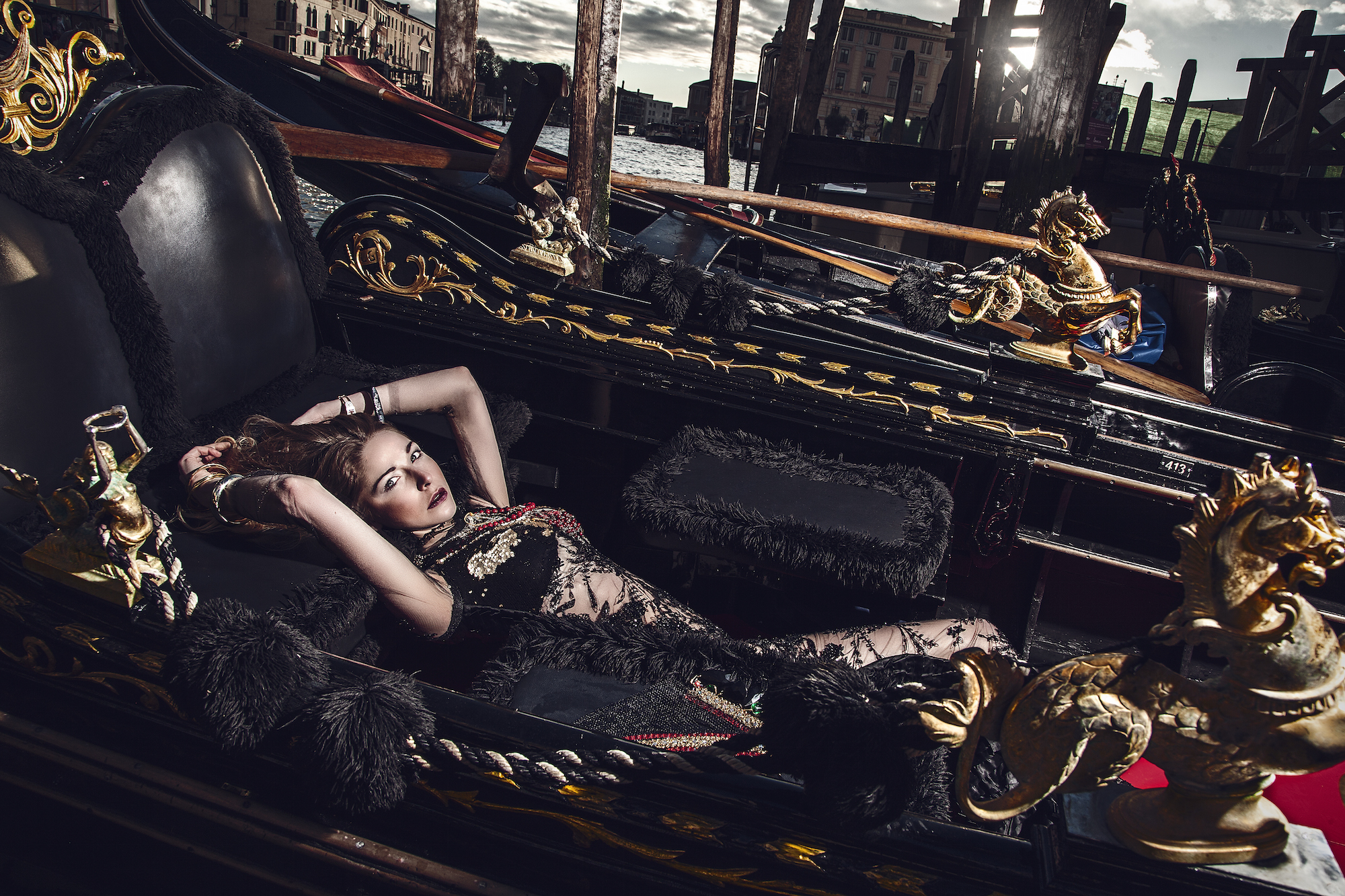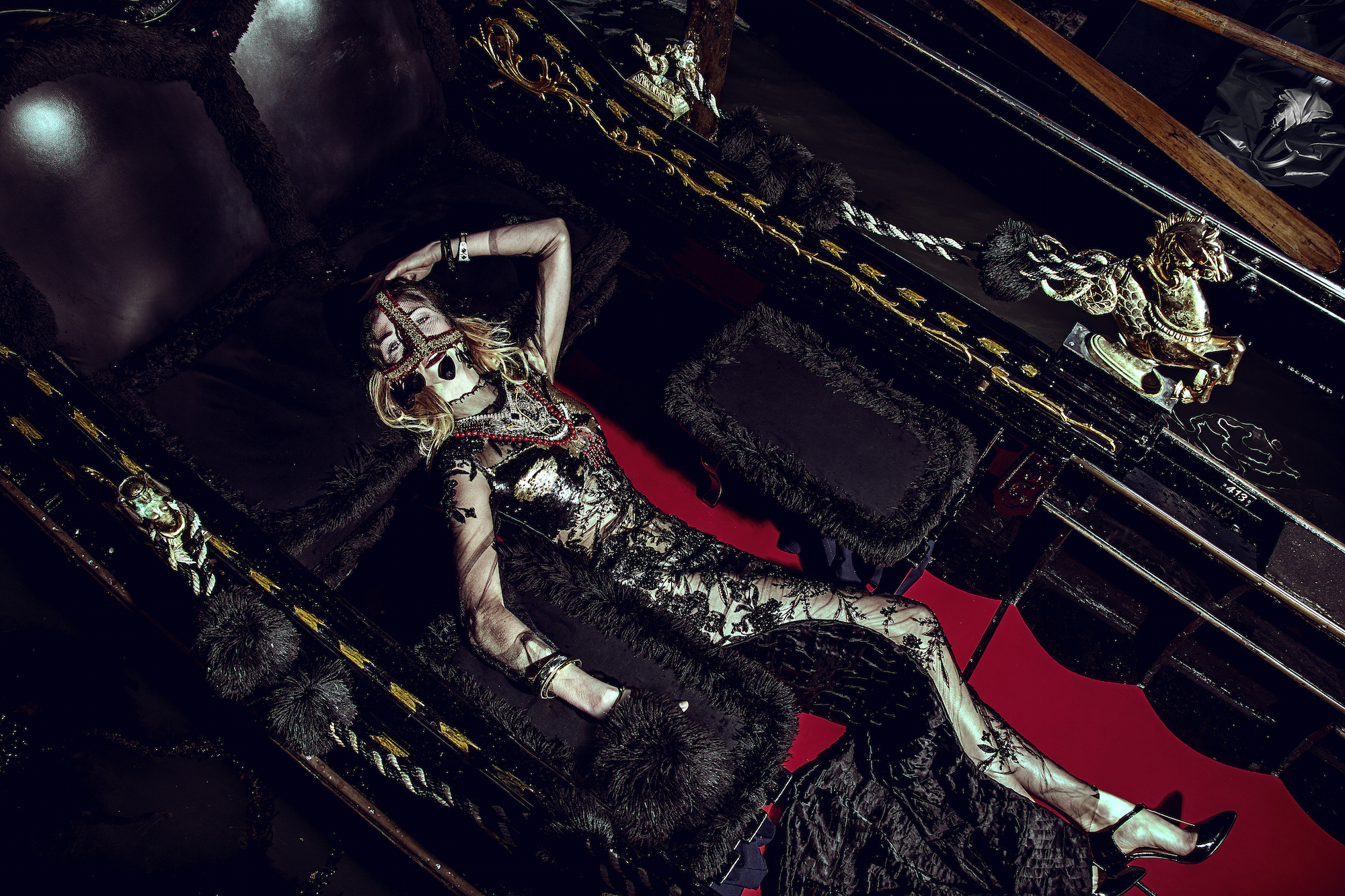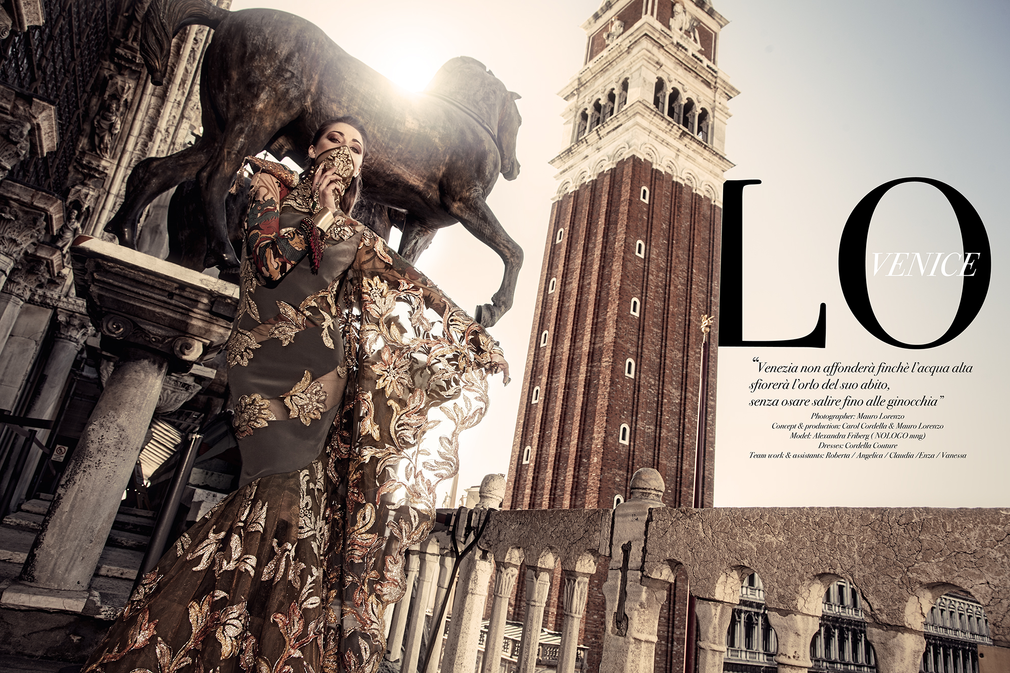 Scattato a Venezia, con modella di Gucci. Fashion editorial uscito su magazine americano e con distribuzione mondiale, insieme ai migliori professionisti del fashion system e del reparto fotografia e styling di moda. Abiti Haute Couture made in italy e pezzi unici.